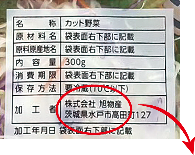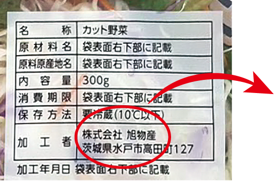 袋、またはパッケージ裏面等に記載されている加工者名が