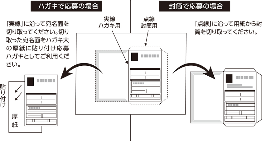 「実線」に沿って宛名面を切り取ってください。切り取った宛名面をハガキ大の厚紙に貼り付け応募ハガキとしてご利用ください。